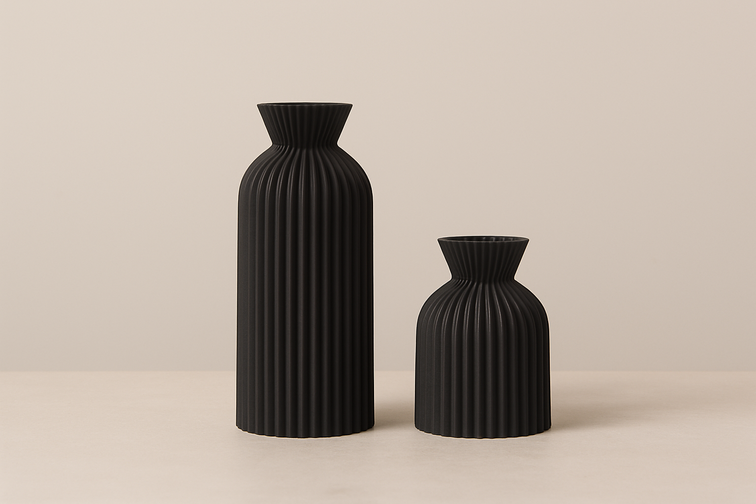 Minimalistyczny wazon o ryflowanej powierzchni w eleganckim kolorze. Idealny do nowoczesnych, skandynawskich wnętrz – pięknie wygląda solo lub w duecie, z kwiatami lub jako rzeźbiarska dekoracja na półce, komodzie czy stole.